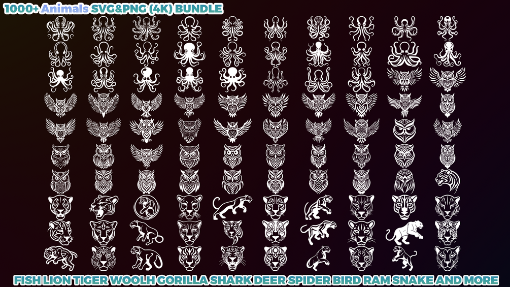 1000+ Animals SVG & PNG Bundle – Hand-Drawn Alphas Clipart for Digital Artists & Designers (Dragon, Wolf, Fish, Horse, Eagle, Bear and more)