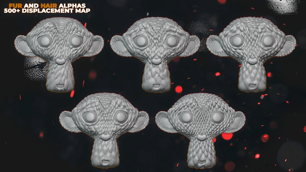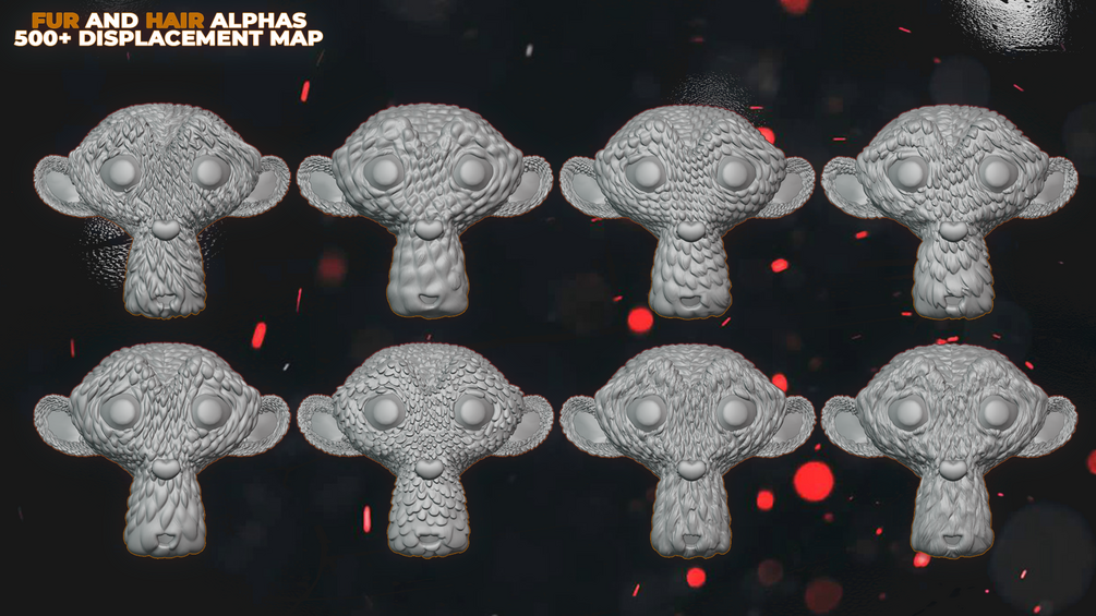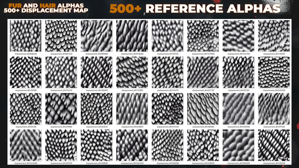 500+ Fur and Hair Alphas is a versatile set designed for creating realistic fur, hair, bristles, and feathers in ZBrush, Blender, Substance Painter, and more.