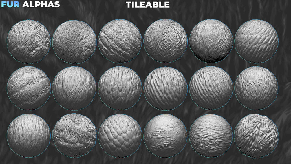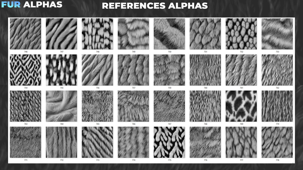 200+ Fur Alphas (Displacement Maps) for ZBrush, Blender, Substance Painter vol.7