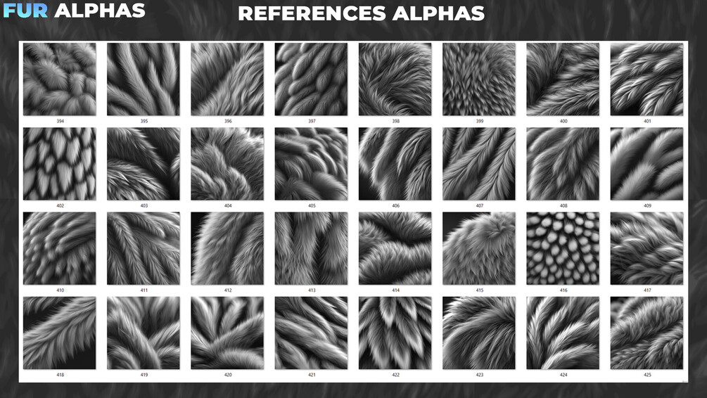 400+ Fur Alphas (Displacement Maps) for ZBrush, Blender, Substance Painter vol.8